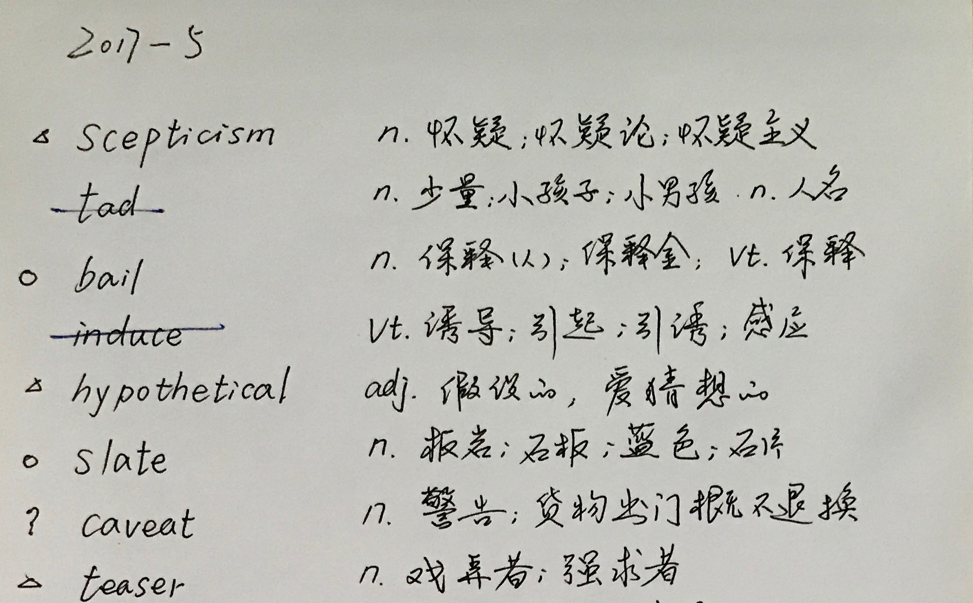高中时具体的做法是:因为当时学校是 10 本书一起发下来的,所以我就花了大概 3 节课的时间把这 10 本书的所有单词过一遍,然后把记不住的全部誊抄下来。 然后我就拥有了一个单词本,之后就经常翻单词本咯。 每一次复习,如果某个单词确定自己掌握了,形成了长期记忆,那就将这个单词从单词本中划掉。 你甚至可以在单词附近做一些记号,比如用 三角形 代表"这是个有趣的单词",圆 代表"这是最近看的某本书或某个视频里面的",耳朵 符号表示"发音比较没把握"等: